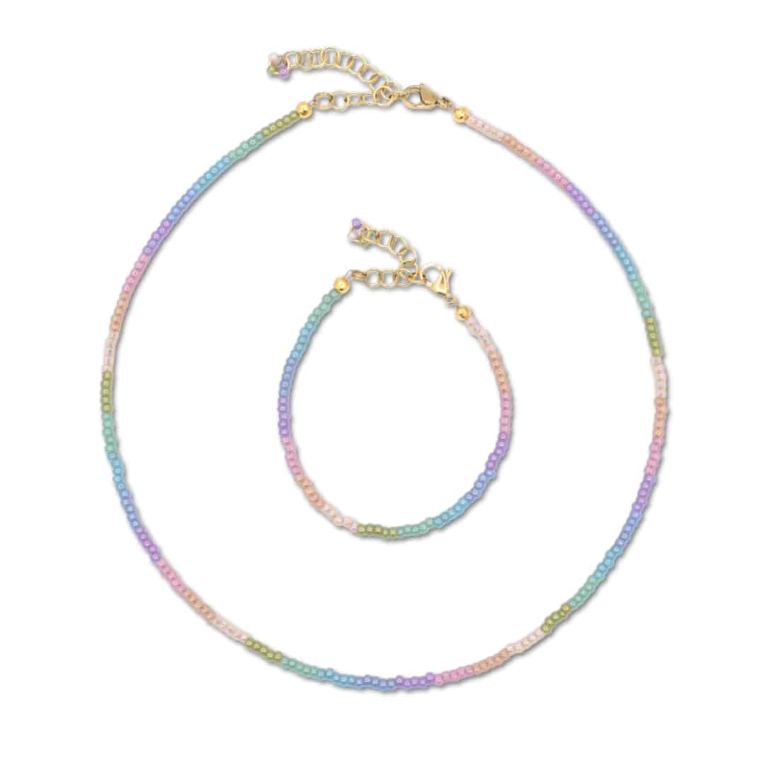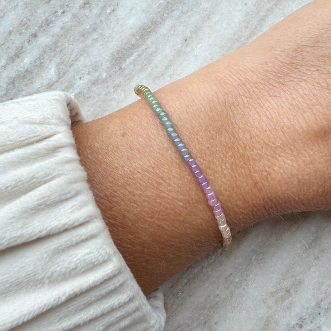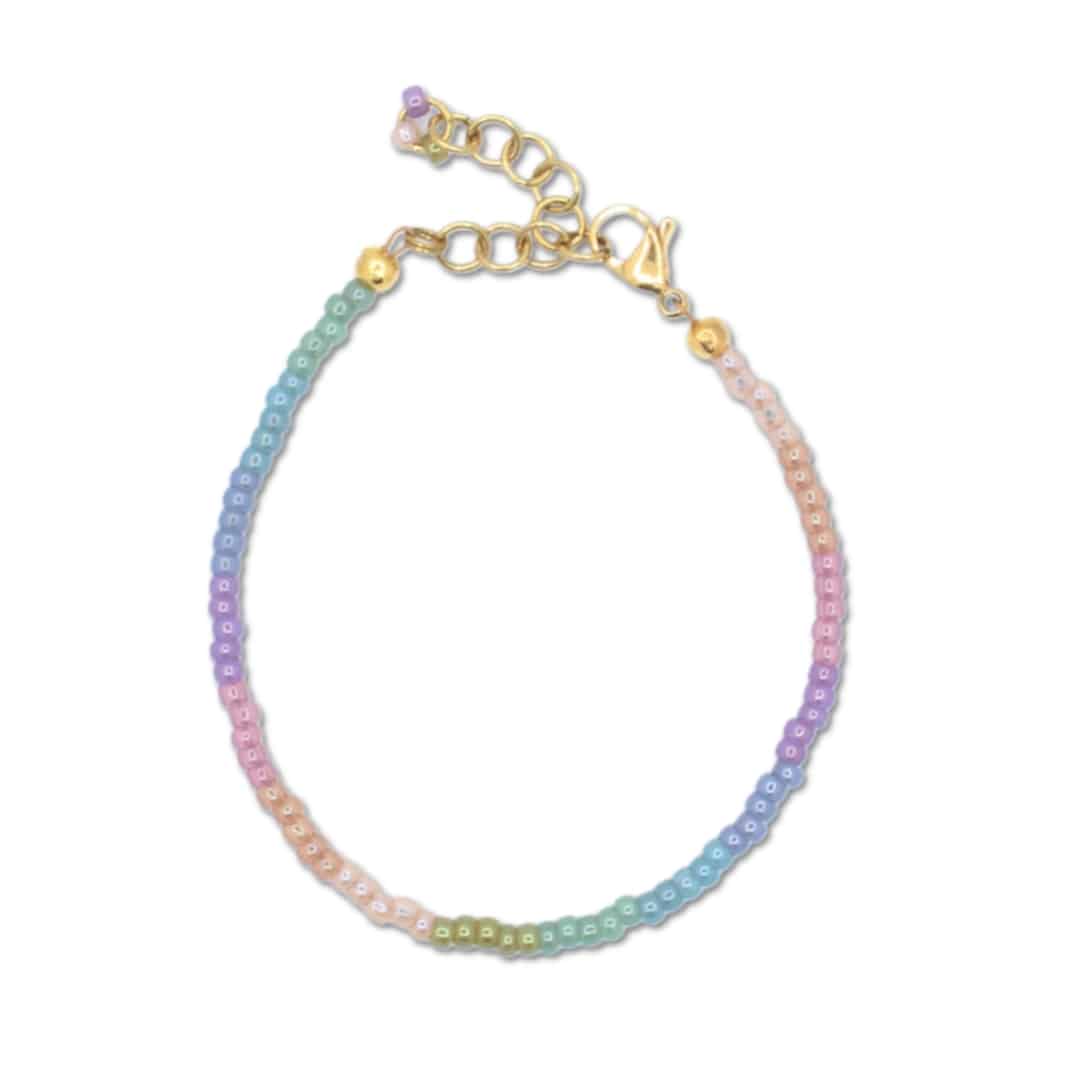 Armband met kleine glaskralen in de pastelkleuren van de regenboog.