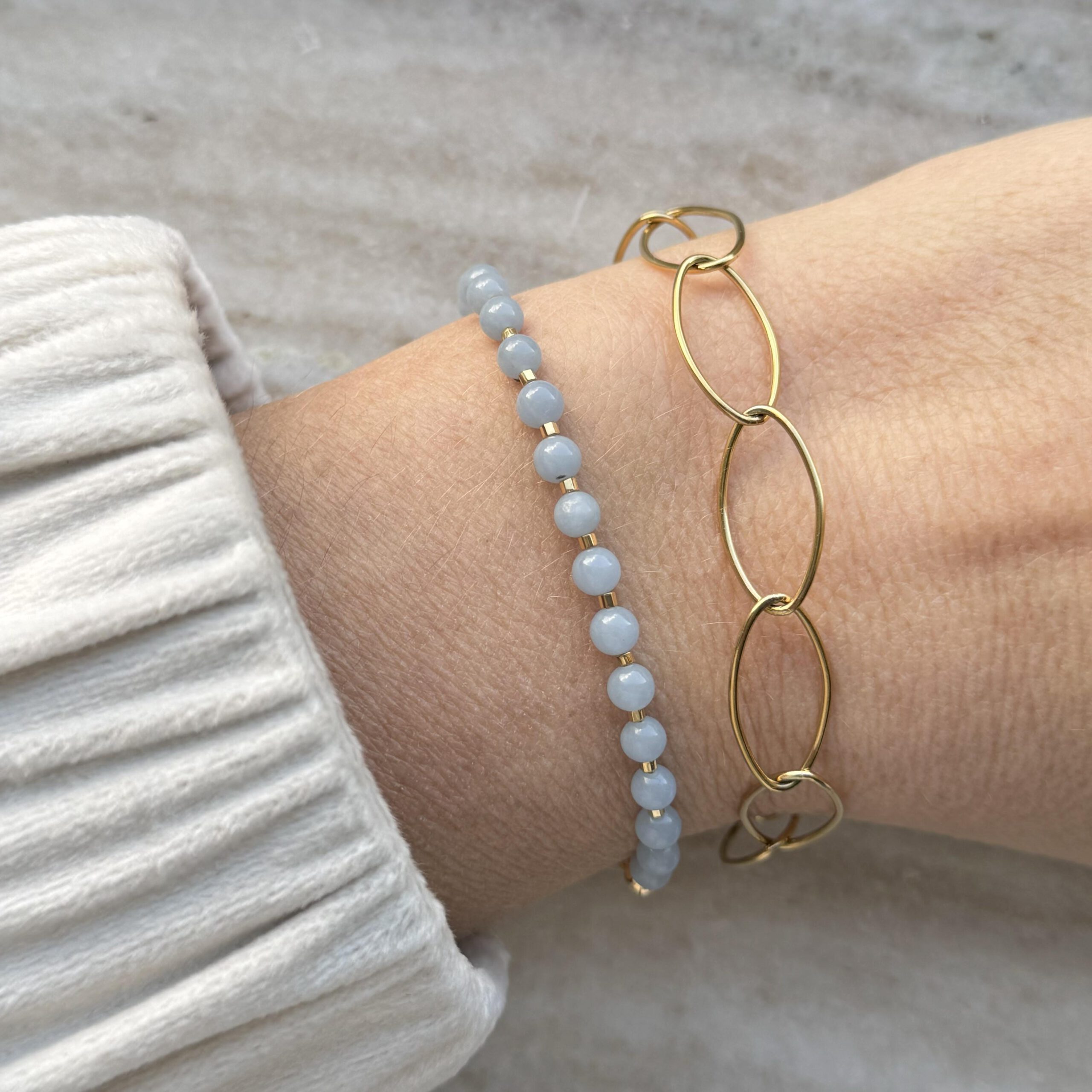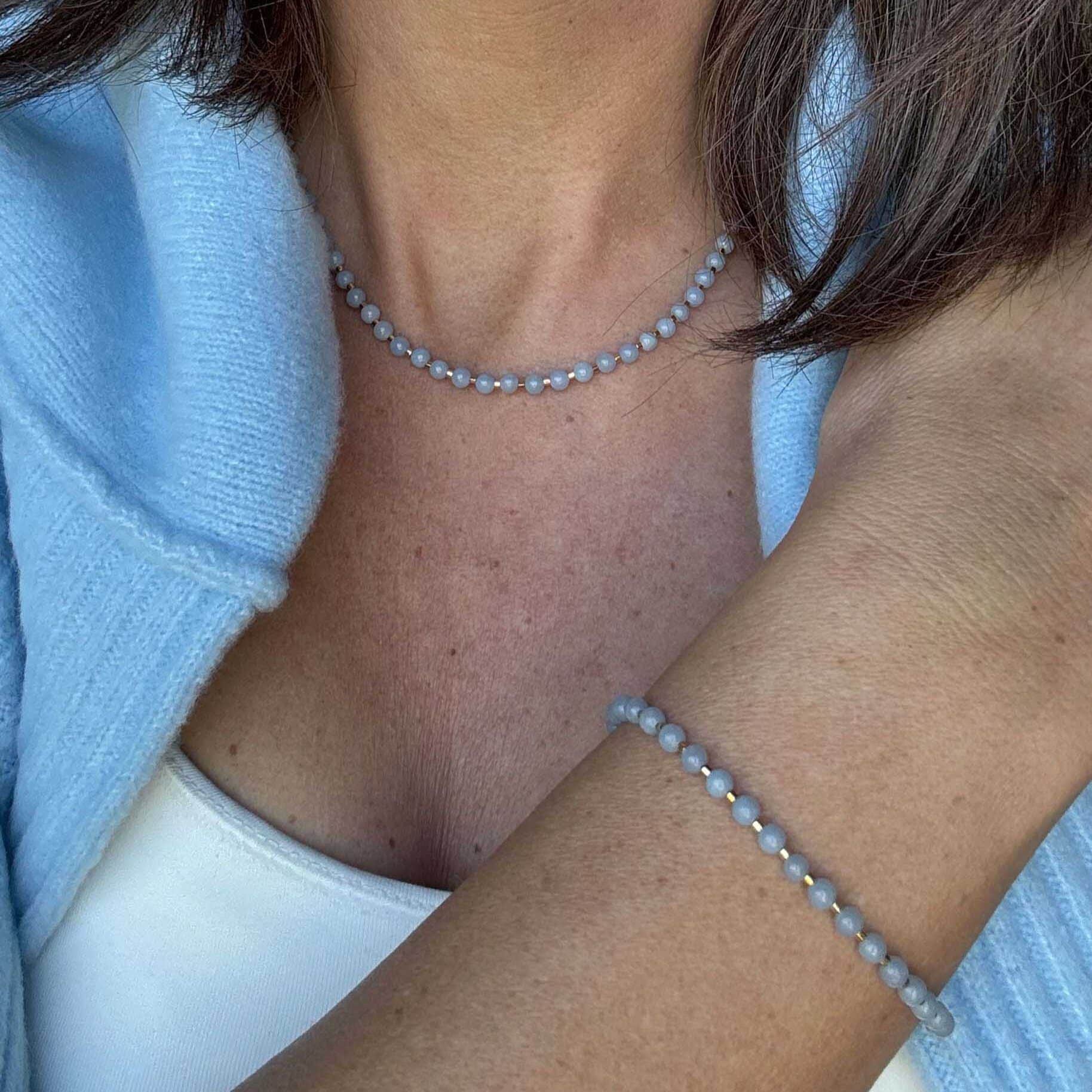 Hoe mooi is deze blauwe armband met Angeliet edelsteenkralen. Het zachte blauw van het Angeliet matcht perfect met de kleine vergulde kralen. Het is ijsblauw in de winter en zeeblauw in de zomer. Een prachtig en tijdloos accessoire of een betekenisvol cadeau. Je maakt je zachtblauw look af met bijpassende ketting Mara.