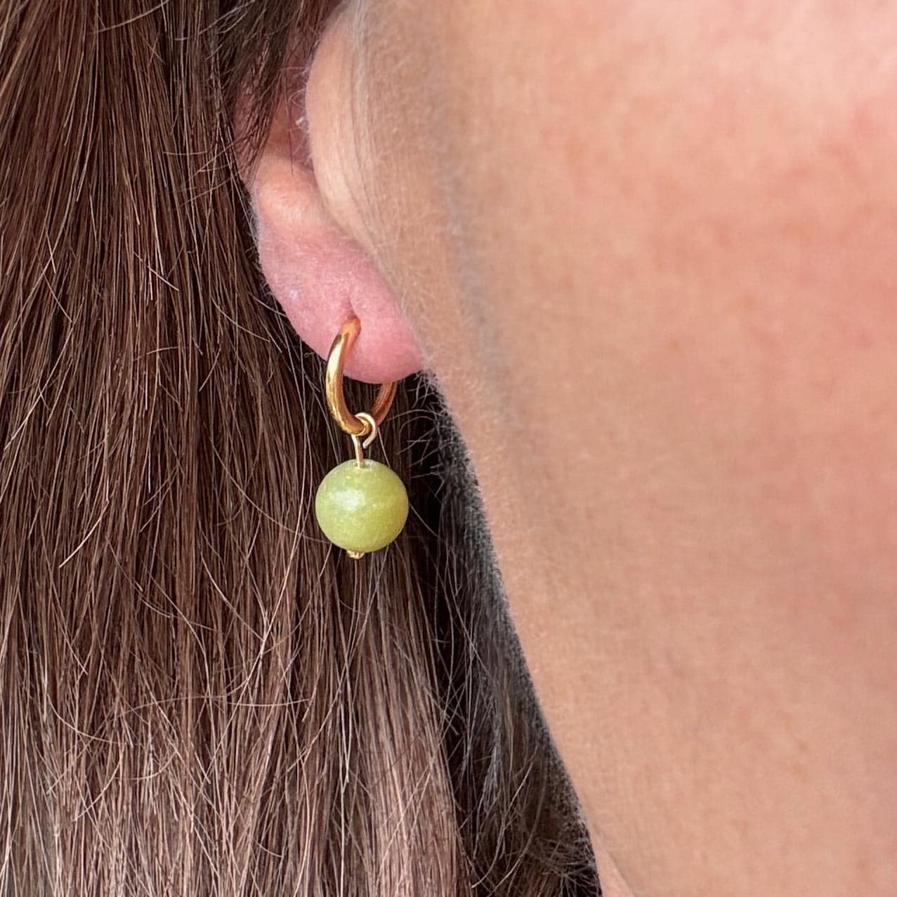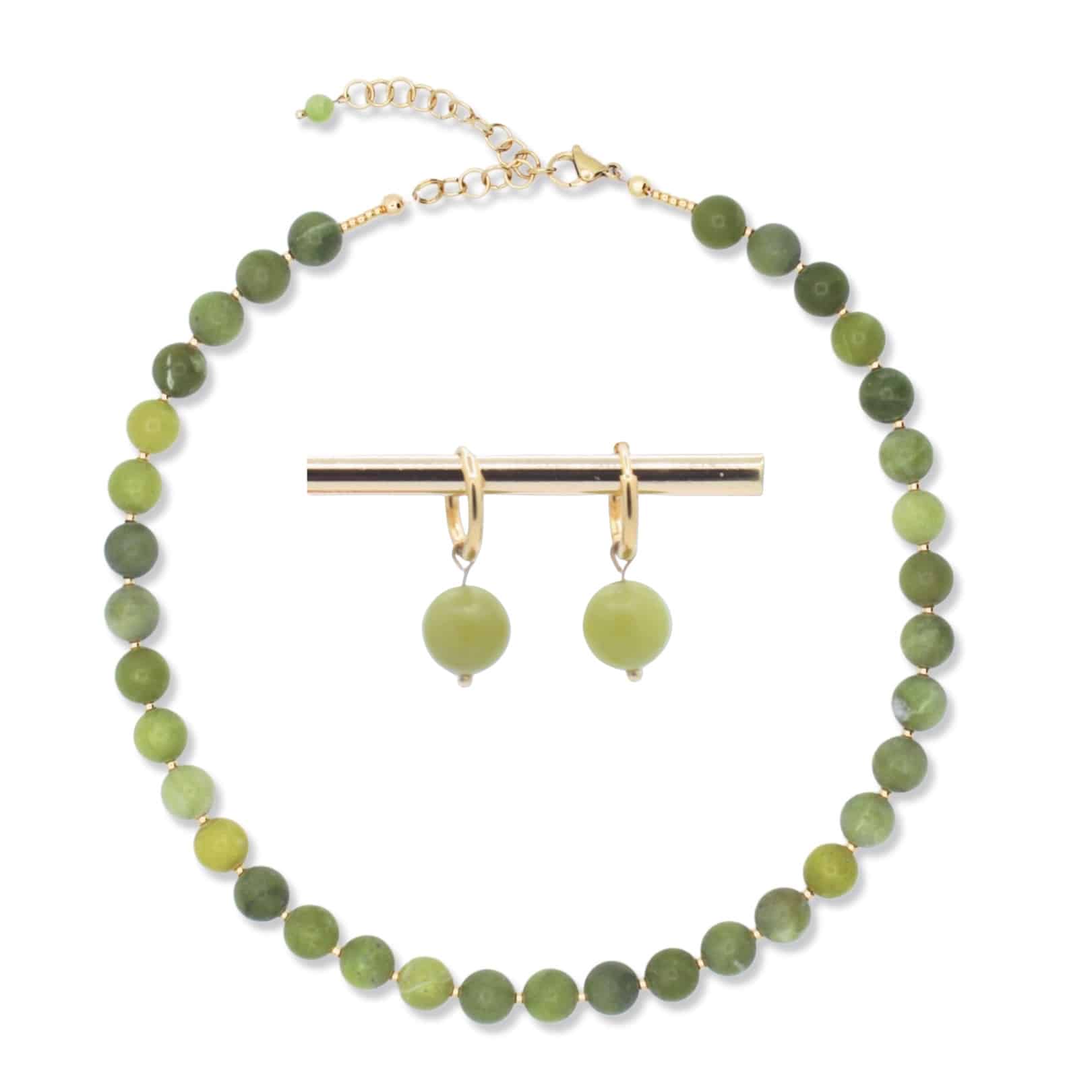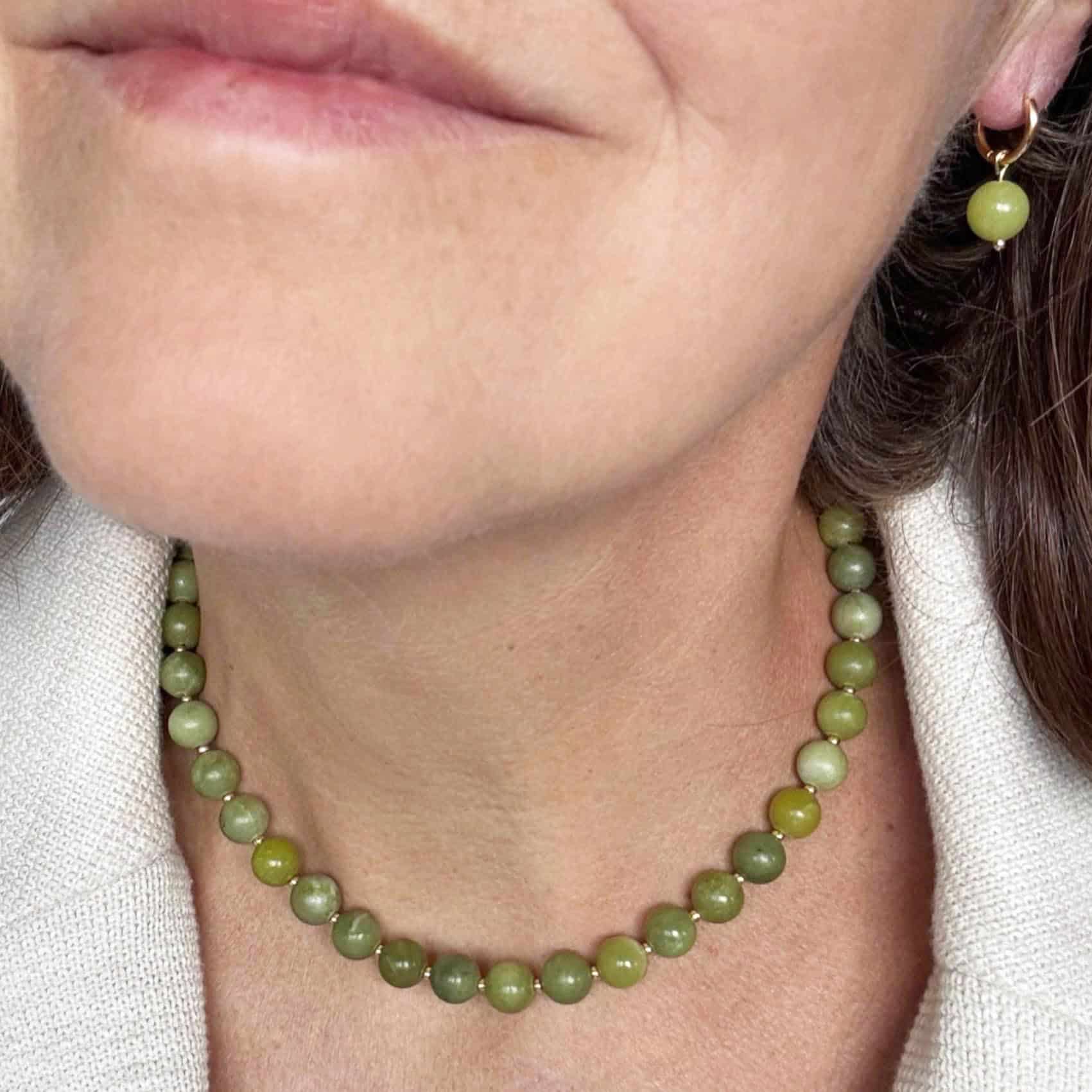 Op zoek naar echte blikvangers? De groene ketting met grote kralen is een stijlvol statement voor de liefhebber van opvallende sieraden. De grote kralen van Serpentijn hebben een natuurlijke, matte groentint die prachtig combineert met de 24k vergulde tussenkralen. De gouden stainless steel sluiting is gemaakt van stainless steel, dus sterk en kleurvast. De groene kralen vind je uiteraard ook terug in de oorbellen, samen met gouden stainless steel ringen met stekers. Draag de sieradenset Coco solo voor een krachtige look of combineer hem met bijpassende kettingen voor een trendy laagjeseffect.