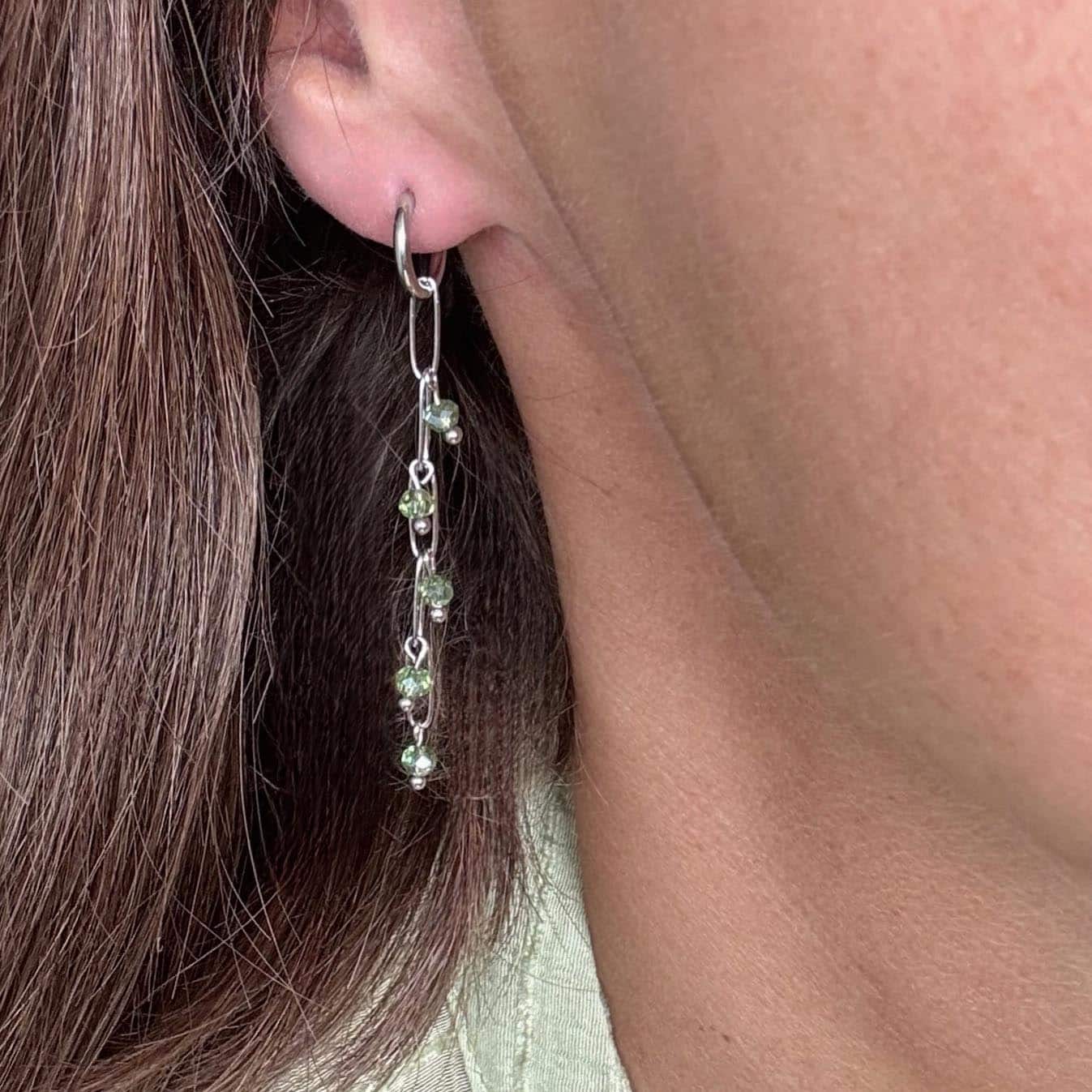 Een zilver sieradensetje met groene kralen dat je nergens anders vindt. De armband is gemaakt van 3 strengen stainless steel schakels met bedels van kleine, groene glaskralen. De oorbellen zijn eveneens van stainless steel en hebben een basis van zilveren ringen met stekers. Door de zachte kleur van het groen, stijl je deze set bij elke look en outfit.